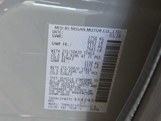 Dark Cargo Package (Black Rear Bumper Film, Cargo Blocks, Cargo Mat, and Medic Kit), 17 Speakers, 3rd row seats: bench, 4-Wheel Disc Brakes, ABS brakes, Air Conditioning, Alloy wheels, AM/FM radio: SiriusXM with 360L, Anti-whiplash front head restraints, Apple CarPlay/Android Auto, Auto High-beam Headlights, Auto tilt-away steering wheel, Auto-dimming door mirrors, Auto-dimming Rear-View mirror, Automatic temperature control, Black Roof Rail Crossbars, Bose Performance Series 17-Speaker Sound System, Brake assist, Bumpers: body-color, Carpeted Floor Mats with Captains Chairs on 3rd Row Tray, Climate Controlled Front Bucket Seats, Delay-off headlights, Driver door bin, Driver vanity mirror, Dual front impact airbags, Dual front side impact airbags, Electronic Stability Control, Emergency communication system: INFINITI InTouch, Four wheel independent suspension, Front anti-roll bar, Front Bucket Seats, Front Center Armrest, Front dual zone A/C, Front reading lights, Fully automatic headlights, Garage door transmitter: HomeLink, Genuine wood door panel insert, Heated door mirrors, Heated front seats, Heated rear seats, Heated steering wheel, Illuminated entry, INFINITI Radiant Dark Illuminated Kick Plates, Knee airbag, Leather Shift Knob, Leather steering wheel, Literature Kit, Low tire pressure warning, Memory seat, Navigation system: Google Built-in, Occupant sensing airbag, Outside temperature display, Overhead airbag, Overhead console, Panic alarm, Passenger door bin, Passenger vanity mirror, Power door mirrors, Power driver seat, Power Liftgate, Power moonroof: Panoramic, Power passenger seat, Power steering, Power windows, Premium Paint, Radio data system, Radio: Klipsch Premium Audio System, Rain sensing wipers, Rear air conditioning, Rear anti-roll bar, Rear reading lights, Rear side impact airbag, Rear window defroster, Rear window wiper, Reclining 3rd row seat, Remote keyless entry, Security system, Speed control, Speed-sensing steering, Speed-Sensitive Wipers, Splash Guards, Split folding rear seat, Spoiler, Steering wheel memory, Steering wheel mounted audio controls, Tachometer, Tailorfit-Appointed Seating Surfaces, Telescoping steering wheel, Tilt steering wheel, Traction control, Trip computer, Turn signal indicator mirrors, Variably intermittent wipers, Ventilated front seats, and Wheels: 20 x 8J Unique Sporty Machined Aluminum Alloy. Price includes: $6000 - Retail Cash. Exp. 05/04/2026