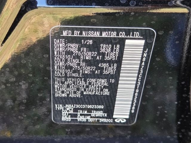 3rd row seats: bench, 4-Wheel Disc Brakes, ABS brakes, Adaptive suspension, Air Conditioning, Alloy wheels, AM/FM radio: SiriusXM with 360L, Anti-whiplash front head restraints, Apple CarPlay/Android Auto, Audio memory, Auto High-beam Headlights, Auto tilt-away steering wheel, Auto-dimming door mirrors, Auto-dimming Rear-View mirror, Auto-leveling suspension, Automatic temperature control, Brake assist, Bumpers: body-color, Compass, Delay-off headlights, Driver door bin, Driver vanity mirror, Dual front impact airbags, Dual front side impact airbags, Electronic Stability Control, Emergency communication system: INFINITI InTouch, Four wheel independent suspension, Front anti-roll bar, Front Bucket Seats, Front Center Armrest, Front dual zone A/C, Front reading lights, Fully automatic headlights, Garage door transmitter: myQ Connected Garage, Genuine wood dashboard insert, Genuine wood door panel insert, Heads-Up Display, Heated and Climate Controlled Front Bucket Seats with Massage, Heated door mirrors, Heated front seats, Heated rear seats, Heated steering wheel, HVAC memory, Illuminated entry, Knee airbag, Leather steering wheel, Low tire pressure warning, Memory seat, Navigation system: Google Built-in, Occupant sensing airbag, Outside temperature display, Overhead airbag, Overhead console, Panic alarm, Passenger door bin, Passenger vanity mirror, Power door mirrors, Power driver seat, Power Liftgate, Power moonroof, Power passenger seat, Power steering, Power windows, Radio data system, Radio: Klipsch Premiere Audio System, Rain sensing wipers, Rear air conditioning, Rear anti-roll bar, Rear reading lights, Rear seat center armrest, Rear window defroster, Rear window wiper, Reclining 3rd row seat, Remote keyless entry, Security system, Semi-Aniline Premium Leather Seating Surfaces, Speed control, Speed-sensing steering, Split folding rear seat, Spoiler, Steering wheel memory, Steering wheel mounted audio controls, Tachometer, Telescoping steering wheel, Tilt steering wheel, Traction control, Trip computer, Turn signal indicator mirrors, Variably intermittent wipers, Ventilated front seats, Ventilated rear seats, and Wheels: 22 x 8.5J Cast Aluminum-Alloy. Price includes: $9000 - Retail Cash. Exp. 03/31/2026