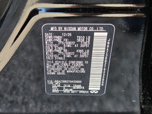 14 Speakers, 3rd row seats: bench, 4-Wheel Disc Brakes, ABS brakes, Adaptive suspension, Air Conditioning, Alloy wheels, AM/FM radio: SiriusXM with 360L, Anti-whiplash front head restraints, Apple CarPlay/Android Auto, Audio memory, Auto High-beam Headlights, Auto tilt-away steering wheel, Auto-dimming door mirrors, Auto-dimming Rear-View mirror, Auto-leveling suspension, Automatic temperature control, Brake assist, Bumpers: body-color, Compass, Delay-off headlights, Driver door bin, Driver vanity mirror, Dual front impact airbags, Dual front side impact airbags, Electronic Stability Control, Emergency communication system: INFINITI InTouch, Four wheel independent suspension, Front anti-roll bar, Front Bucket Seats, Front Center Armrest, Front dual zone A/C, Front reading lights, Fully automatic headlights, Garage door transmitter: myQ Connected Garage, Heads-Up Display, Heated and Climate Controlled Front Bucket Seats, Heated door mirrors, Heated front seats, Heated rear seats, Heated steering wheel, HVAC memory, Illuminated entry, Knee airbag, Leather Seating Surfaces, Leather steering wheel, Low tire pressure warning, Memory seat, Navigation system: Google Built-in, Occupant sensing airbag, Outside temperature display, Overhead airbag, Overhead console, Panic alarm, Passenger door bin, Passenger vanity mirror, Power door mirrors, Power driver seat, Power Liftgate, Power moonroof, Power passenger seat, Power steering, Power windows, Radio data system, Radio: Klipsch Premium Audio System, Rain sensing wipers, Rear air conditioning, Rear anti-roll bar, Rear reading lights, Rear seat center armrest, Rear window defroster, Rear window wiper, Reclining 3rd row seat, Remote keyless entry, Security system, Speed control, Speed-sensing steering, Split folding rear seat, Spoiler, Steering wheel memory, Steering wheel mounted audio controls, Tachometer, Telescoping steering wheel, Tilt steering wheel, Traction control, Trip computer, Turn signal indicator mirrors, Variably intermittent wipers, Ventilated front seats, Ventilated rear seats, and Wheels: 22 x 8.5J Cast Aluminum Alloy. Price includes: $7000 - Retail Cash. Exp. 03/31/2026