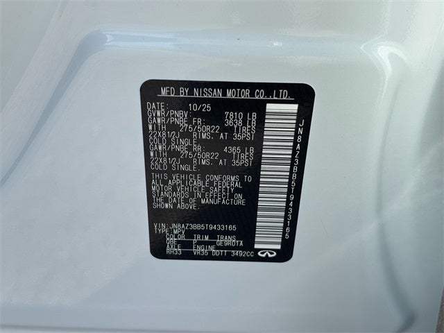 Cargo Package (Cargo Blocks/Stabilizers, Cargo Net, Carpeted Cargo Area Protector, Console Net, and Soft-Sided Cargo Cooler), Exterior Package (Silver Rear Bumper Protector and Silver Roof Rail Crossbars), Silver Interior Lighting Package (INFINITI Radiant Silver Cargo Scuff Plates and Panoramic Illuminated Headliner), 14 Speakers, 3rd row seats: bench, 4-Wheel Disc Brakes, ABS brakes, Adaptive suspension, Air Conditioning, Alloy wheels, AM/FM radio: SiriusXM with 360L, Anti-whiplash front head restraints, Apple CarPlay/Android Auto, Audio memory, Auto High-beam Headlights, Auto tilt-away steering wheel, Auto-dimming door mirrors, Auto-dimming Rear-View mirror, Auto-leveling suspension, Automatic temperature control, Brake assist, Bumpers: body-color, Compass, Delay-off headlights, Driver door bin, Driver vanity mirror, Dual front impact airbags, Dual front side impact airbags, Electronic Stability Control, Emergency communication system: INFINITI InTouch, Four wheel independent suspension, Front anti-roll bar, Front Bucket Seats, Front Center Armrest, Front dual zone A/C, Front reading lights, Fully automatic headlights, Garage door transmitter: myQ Connected Garage, Heads-Up Display, Heated and Climate Controlled Front Bucket Seats, Heated door mirrors, Heated front seats, Heated rear seats, Heated steering wheel, HVAC memory, Illuminated entry, INFINITI Radiant Illuminated Silver Kick Plates, Knee airbag, Leather Seating Surfaces, Leather steering wheel, Low tire pressure warning, Memory seat, Navigation system: Google Built-in, Occupant sensing airbag, Outside temperature display, Overhead airbag, Overhead console, Panic alarm, Passenger door bin, Passenger vanity mirror, Power door mirrors, Power driver seat, Power Liftgate, Power moonroof, Power passenger seat, Power steering, Power windows, Radio data system, Radio: Klipsch Premium Audio System, Rain sensing wipers, Rear air conditioning, Rear anti-roll bar, Rear reading lights, Rear seat center armrest, Rear window defroster, Rear window wiper, Reclining 3rd row seat, Remote keyless entry, Security system, Speed control, Speed-sensing steering, Splash Guards, Split folding rear seat, Spoiler, Steering wheel memory, Steering wheel mounted audio controls, Super Premium Paint, Tachometer, Telescoping steering wheel, Tilt steering wheel, Traction control, Trip computer, Turn signal indicator mirrors, Variably intermittent wipers, Ventilated front seats, Ventilated rear seats, and Wheels: 22 x 8.5J Cast Aluminum Alloy. Price includes: $7000 - Retail Cash. Exp. 02/02/2026