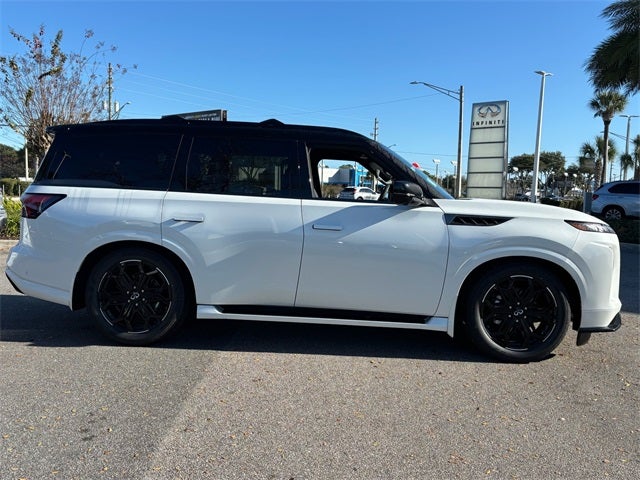 Sport Exterior Package (Black Roof Rail Crossbars and Dark Chrome Rear Bumper Protector), 3rd row seats: bench, 4-Wheel Disc Brakes, ABS brakes, Adaptive suspension, Air Conditioning, Alloy wheels, AM/FM radio: SiriusXM with 360L, Anti-whiplash front head restraints, Apple CarPlay/Android Auto, Audio memory, Auto High-beam Headlights, Auto tilt-away steering wheel, Auto-dimming door mirrors, Auto-dimming Rear-View mirror, Auto-leveling suspension, Automatic temperature control, Brake assist, Compass, Delay-off headlights, Driver door bin, Driver vanity mirror, Dual front impact airbags, Dual front side impact airbags, Electronic Stability Control, Emergency communication system: INFINITI InTouch, Four wheel independent suspension, Front anti-roll bar, Front Bucket Seats, Front Center Armrest, Front dual zone A/C, Front reading lights, Fully automatic headlights, Garage door transmitter: HomeLink, Genuine wood dashboard insert, Genuine wood door panel insert, Heads-Up Display, Heated and Climate Controlled Front Bucket Seats with Massage, Heated door mirrors, Heated front seats, Heated rear seats, Heated steering wheel, HVAC memory, Illuminated entry, Knee airbag, Leather steering wheel, Low tire pressure warning, Memory seat, Navigation system: Google Built-in, Occupant sensing airbag, Outside temperature display, Overhead airbag, Overhead console, Panic alarm, Passenger door bin, Passenger vanity mirror, Power door mirrors, Power driver seat, Power Liftgate, Power moonroof, Power passenger seat, Power steering, Power windows, Radio data system, Radio: Klipsch Premiere Audio System, Rain sensing wipers, Rear air conditioning, Rear anti-roll bar, Rear reading lights, Rear seat center armrest, Rear window defroster, Rear window wiper, Reclining 3rd row seat, Remote keyless entry, Security system, Speed control, Speed-sensing steering, Splash Guards, Split folding rear seat, Spoiler, Steering wheel memory, Steering wheel mounted audio controls, Tachometer, Telescoping steering wheel, Tilt steering wheel, Traction control, Trip computer, Turn signal indicator mirrors, Two-Tone Super Premium Paint, Unique SPORT Semi-Aniline Leather Seating Surfaces, Variably intermittent wipers, Ventilated front seats, Ventilated rear seats, and Wheels: 22 x 8.5J Unique SPORT Alloy. Price includes: $2000 - SPORT Trim RETAIL Bonus Cash. Exp. 02/02/2026 $7000 - Retail Cash. Exp. 02/02/2026