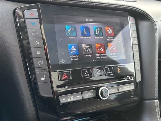 - Radio: HD Audio System -inc: INFINITI InTouch, INFINITI InTouch services, INFINITI InTouch dual display system w/upper 8" and lower 7" HD touch screens, wireless Apple CarPlay, Android Auto, HD radio technology, SiriusXM radio w/advanced audio features and 90-day complimentary trial, INFINITI voice recognition, Siri Eyes Free, Wi-Fi hotspot and active noise cancellation