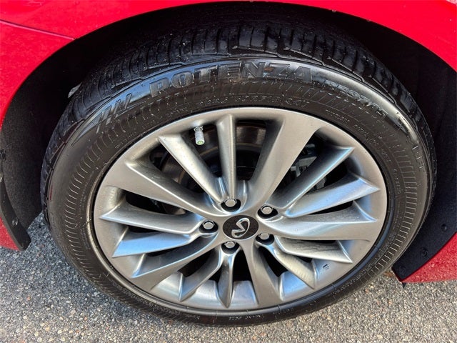 Cargo Package (Cargo Net, First Aid Kit, Shopping Bag Hooks, and Trunk Mat), INFINITI Certified Pre-Owned Certified, 16 Speakers, 18 x 7.5 Aluminum Alloy Wheels, 4-Wheel Disc Brakes, ABS brakes, Air Conditioning, Alloy wheels, AM/FM radio: SiriusXM, Auto High-beam Headlights, Auto tilt-away steering wheel, Auto-dimming Rear-View mirror, Automatic temperature control, Blind Spot Warning, Brake assist, Bumpers: body-color, CD player, Compass, Delay-off headlights, Driver door bin, Driver vanity mirror, Dual front impact airbags, Dual front side impact airbags, Electronic Stability Control, Emergency communication system: INFINITI Connection, Exclusive Paint - Dynamic Sunstone Red, Exterior Parking Camera Rear, Four wheel independent suspension, Front anti-roll bar, Front Bucket Seats, Front Center Armrest, Front dual zone A/C, Front fog lights, Front reading lights, Fully automatic headlights, Garage door transmitter: HomeLink, Heated door mirrors, Heated Front Bucket Seats, Heated front seats, Heated steering wheel, Illuminated entry, Leather Shift Knob, Leather steering wheel, Leather-Appointed Seating Surfaces, Literature Kit, Low tire pressure warning, Memory seat, Occupant sensing airbag, Outside temperature display, Overhead airbag, Overhead console, Panic alarm, Passenger door bin, Passenger vanity mirror, Power door mirrors, Power driver seat, Power moonroof, Power passenger seat, Power steering, Power windows, Radio data system, Radio: INFINITI InTouch Dual HD Display System, Rain sensing wipers, Rear anti-roll bar, Rear reading lights, Rear seat center armrest, Rear USB/Power Delivery Port, Rear window defroster, Remote keyless entry, Security system, Speed control, Speed-Sensitive Wipers, Splash Guards, Split folding rear seat, Steering wheel memory, Steering wheel mounted audio controls, Tachometer, Telescoping steering wheel, Tilt steering wheel, Traction control, Trip computer, Turn signal indicator mirrors, and Variably intermittent wipers.