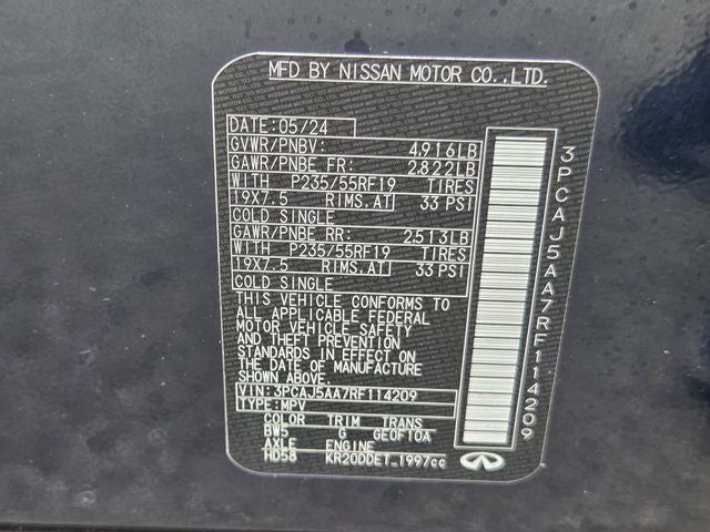 INFINITI Certified Pre-Owned Certified, 4-Wheel Disc Brakes, 5.846 Axle Ratio, 6 Speakers, ABS brakes, Air Conditioning, Alloy wheels, AM/FM radio: SiriusXM, Auto High-beam Headlights, Auto-dimming Rear-View mirror, Automatic temperature control, Brake assist, Bumpers: body-color, CD player, Delay-off headlights, Driver door bin, Driver vanity mirror, Dual front impact airbags, Dual front side impact airbags, Electronic Stability Control, Emergency communication system: INFINITI InTouch (1-year complimentary trial), Exterior Parking Camera Rear, Floor Mats, Four wheel independent suspension, Front anti-roll bar, Front Bucket Seats, Front Center Armrest, Front dual zone A/C, Front reading lights, Fully automatic headlights, Heated door mirrors, Illuminated entry, Knee airbag, Leather Shift Knob, Leather steering wheel, Leatherette Seat Trim, Literature Kit, Low tire pressure warning, Occupant sensing airbag, Outside temperature display, Overhead airbag, Overhead console, Panic alarm, Passenger door bin, Passenger vanity mirror, Power door mirrors, Power driver seat, Power Liftgate, Power passenger seat, Power steering, Power windows, Radio data system, Radio: HD Audio System, Rear anti-roll bar, Rear Parking Sensors, Rear reading lights, Rear seat center armrest, Rear side impact airbag, Rear window defroster, Rear window wiper, Remote keyless entry, Security system, Speed control, Speed-sensing steering, Speed-Sensitive Wipers, Splash Guards (Set of 4), Split folding rear seat, Spoiler, Steering wheel mounted audio controls, Tachometer, Telescoping steering wheel, Tilt steering wheel, Traction control, Trip computer, Turn signal indicator mirrors, Variably intermittent wipers, and Wheels: 19 Silver Painted Aluminum Alloy.